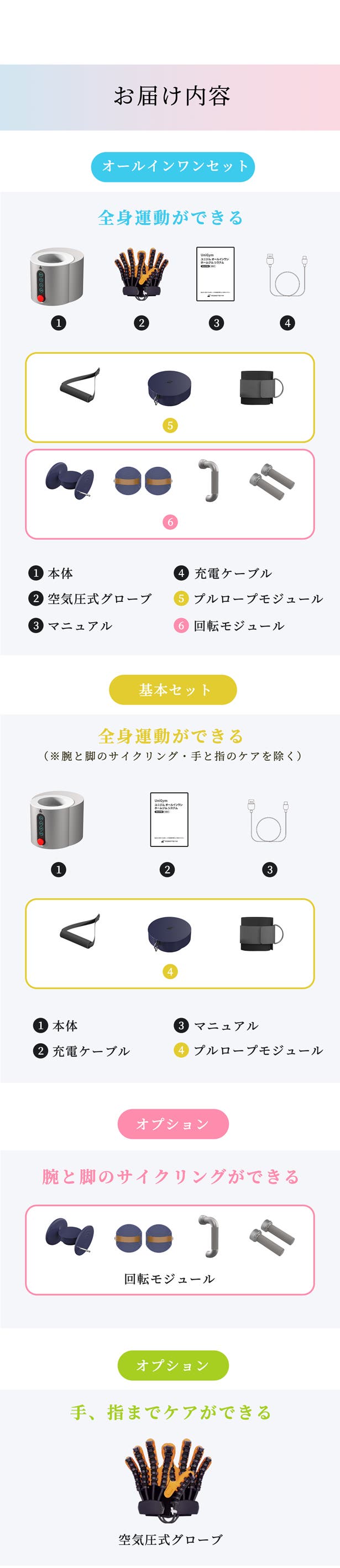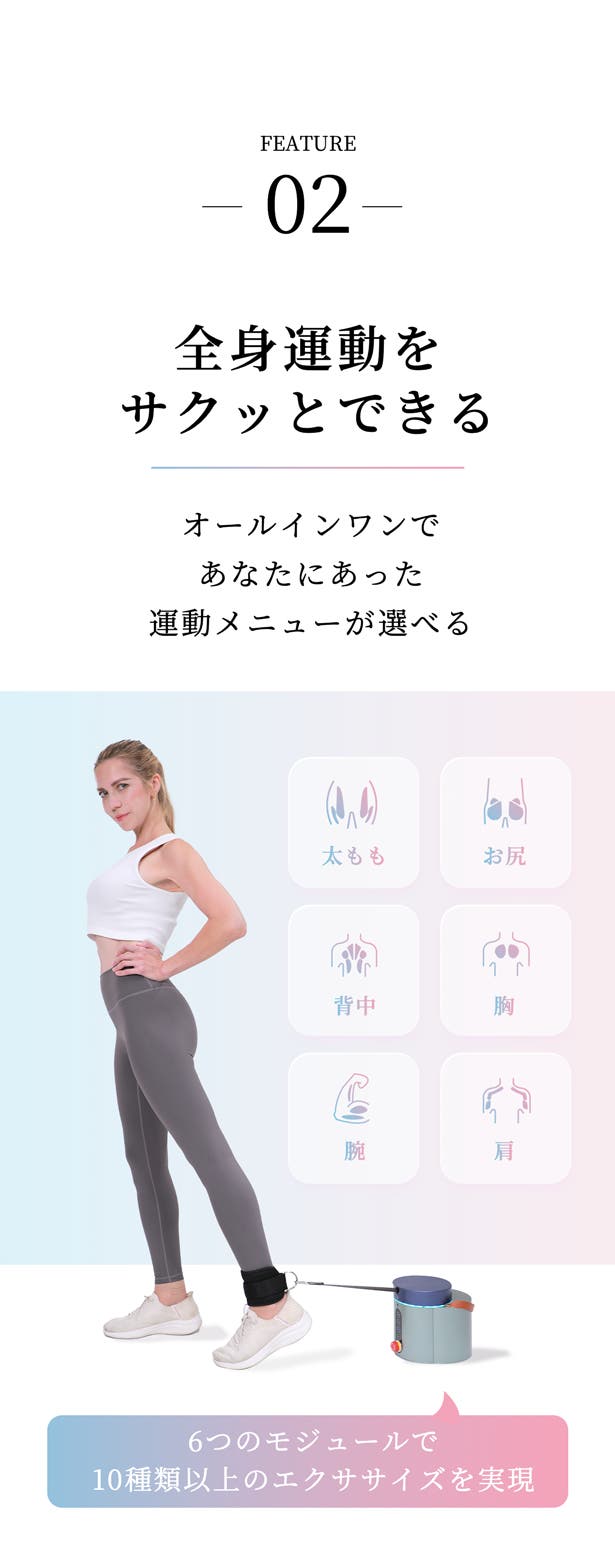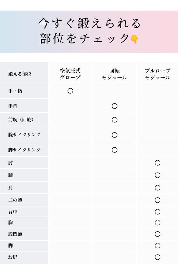 A:指、上半身(腕・肩・背中)、下半身(脚・お尻)など、全身の様々な部位をカバーできます。モジュール式設計で付属品を簡単に切り替えれば、10種類以上のトレーニング種目に対応し、非常に幅広いトレーニングが可能です。