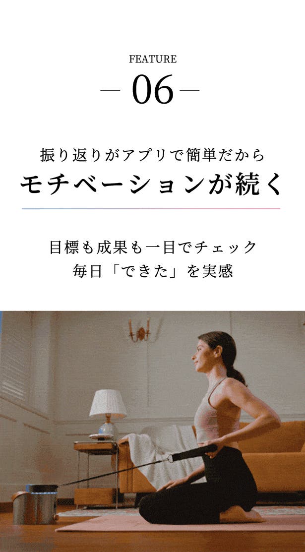 A:お子さまからお年寄りの方まで、どなたでも簡単に操作できます。運動が苦手な方や初心者の方に特にオススメです!また、専用アプリの画面も直感的でシンプルな設計です。さらにアプリ内には13種類のトレーニング動作の詳しい動画解説が収録されているので、初心者でも安心して正しいフォームを真似できます。誤った動作による問題を効果的に回避し、安全に練習できます。