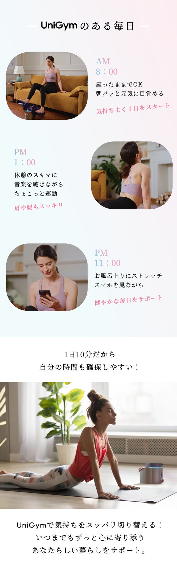 A:UniGym(ユニジム)は、自宅で身体機能のトレーニングや日常のフィットネス活動をサポートし、オールインワンのホームトレーニングシステムです。専用アプリと連携し、専門トレーニング動作ガイドを提供しながら、安全かつ効果的に自宅で運動できます。