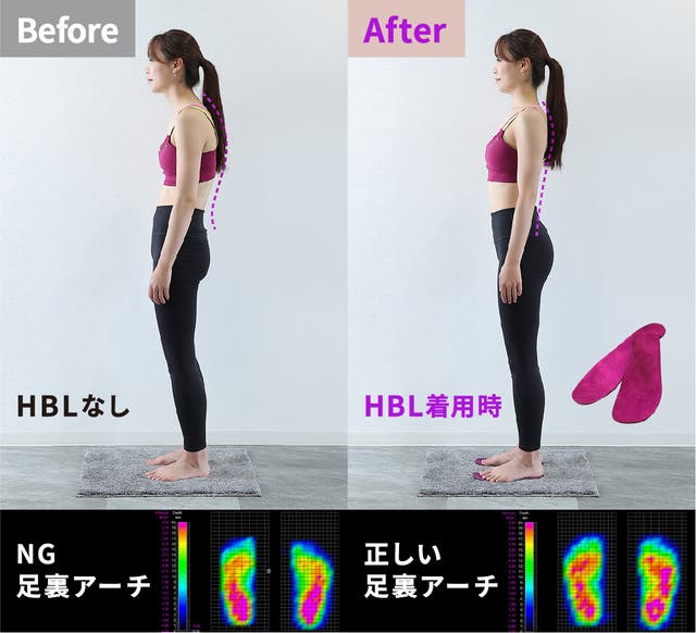 HBLは25万人以上の足型データを分析し、30代・40代・50代の日本人女性の最適なアーチ形状でデザインしました。足裏アーチを正しくサポートすることで体が安定し、正しい姿勢で立ちやすくなります。