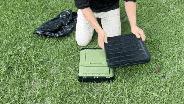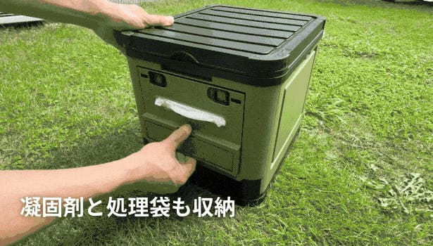 匂いを逃さない密閉構造「二重防臭:凝固剤で匂いを閉じ込め、密閉蓋で物理的にブロック」