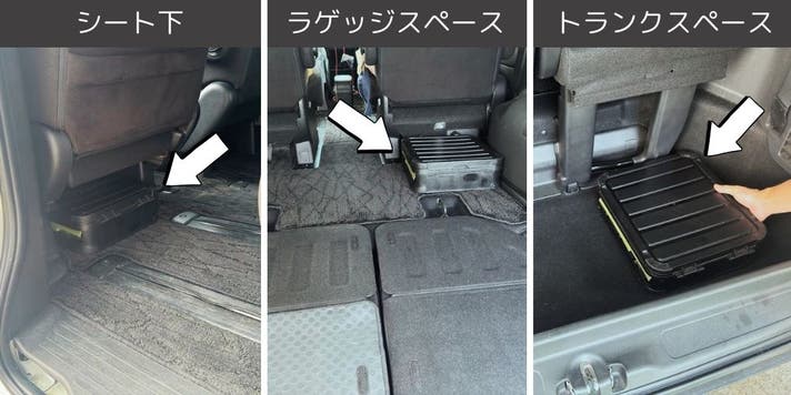 シート下・ラゲッジスペース・トランクの隙間にぴったり収まる薄型設計。車載しておけば、外出中の“もしも”にも即対応できます。