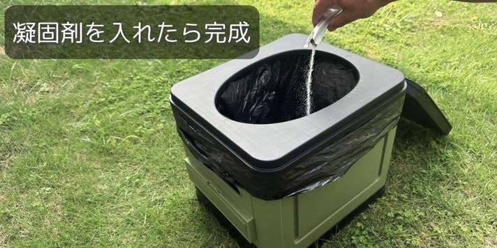 付属の凝固剤を入れて簡単にトイレが完成。「すぐ使える」ことは、防災において最も重要です。