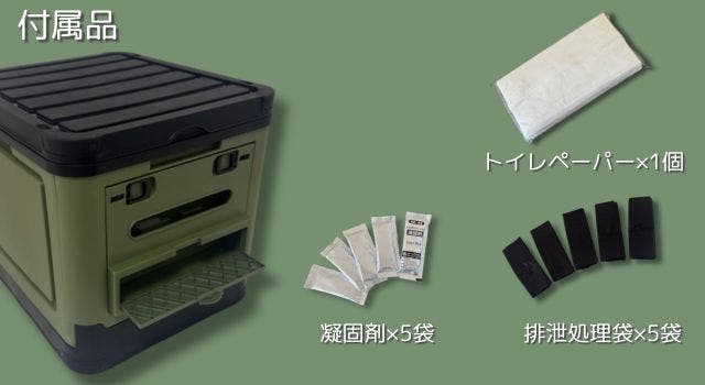 本体・排泄処理袋×5袋・凝固剤×5セット・トイレットペーパー×1セット