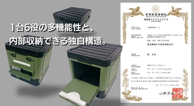 - 【特許庁の実用新案登録済み】独自の構造が公式に認められた多機能ポータブルトイレ