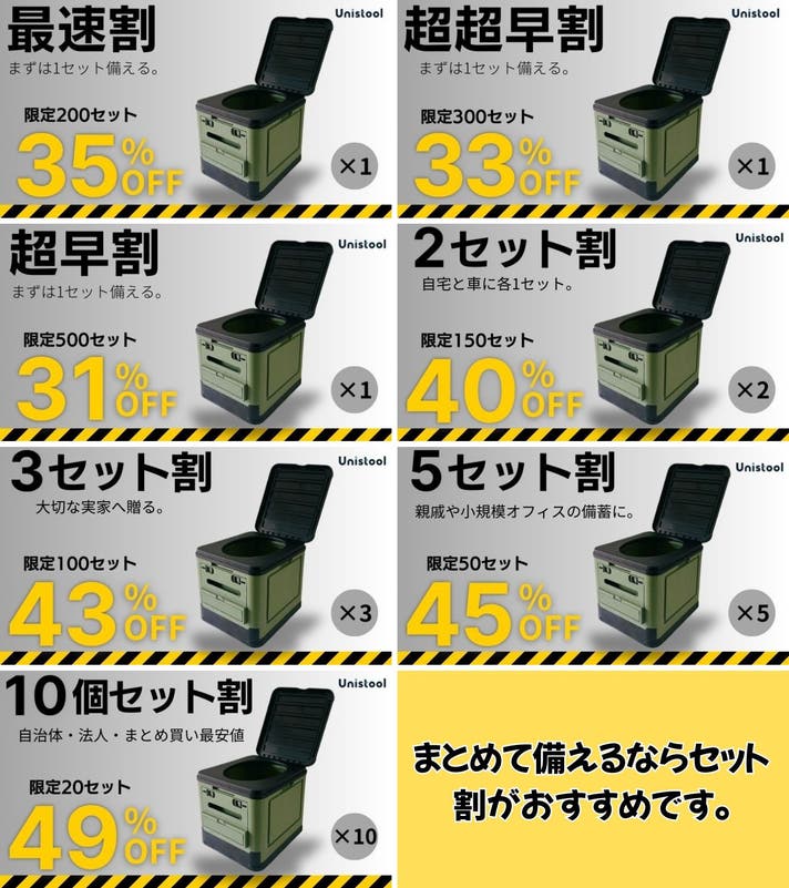 1セットあたり5,635円もお得に。町内会・自治会・防災訓練や地域備蓄にまとめて導入したい方に。1台あたりのコストを抑えつつ、トイレ環境をしっかり整えられるセットです。