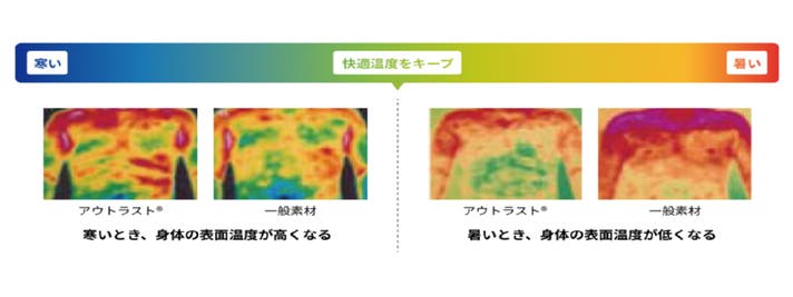 ※米アウトラスト社調べによると、アウトラストを使用したアウターウェアと、一般素材を使ったものを比較実験してみると、身体の表面温度は、ここまで変わります。