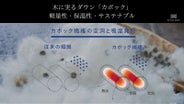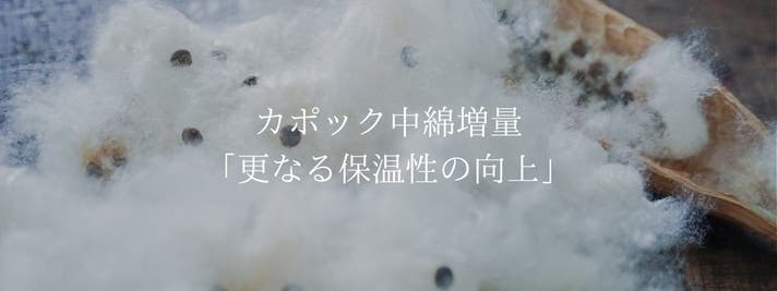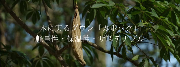 カポックは東南アジアに自生する植物で、その実から取れる綿は、コットンの1/8の軽さに加え、湿気を吸って暖かくなる吸湿発熱性を持っています。まさに、サステナブルで機能的な"木に実るダウン"として注目されてきました。