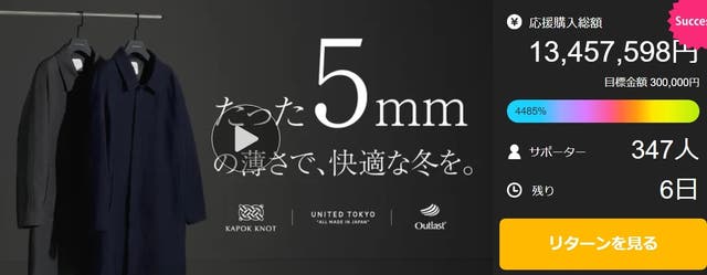 「Makuake(マクアケ)」は、実行者の想いを応援購入によって実現するアタラシイものやサービスのプラットフォームです。このページは、 ファッションカテゴリの 「【熱すぎず極暖】宇宙服技術2つ搭載、冷気遮断と温度調節による『未来の防寒着』誕生」プロジェクト詳細ページです。