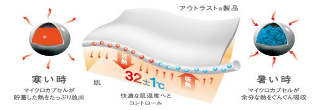 マイクロカプセルの中に、石油を原料とした天然ワックス『パラフィンワックス』が存在しており、それが、暑いときは体からの余分な熱を吸収、寒いときは蓄えていた熱を放出します。