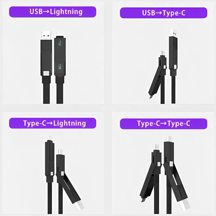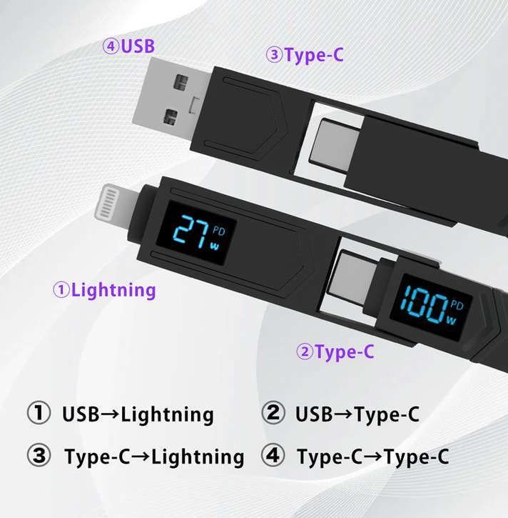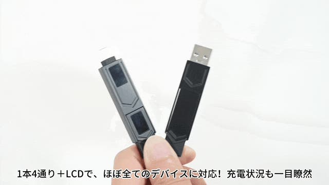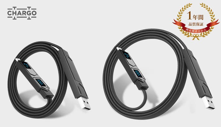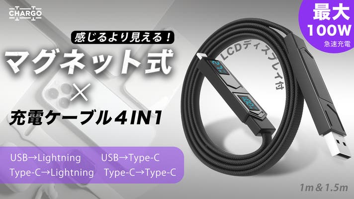 CHARGO 4in1マグネット式充電ケーブルは、LCDディスプレイ搭載で充電速度をリアルタイムに確認でき、バンド不要の磁力ホールド&フラット設計で絡まずスマートに収納可能。最大100W出力でアダプター交換不要、1台でスマートフォンやタブレット、ノートパソコンなどさまざまなデバイスを充電できます。