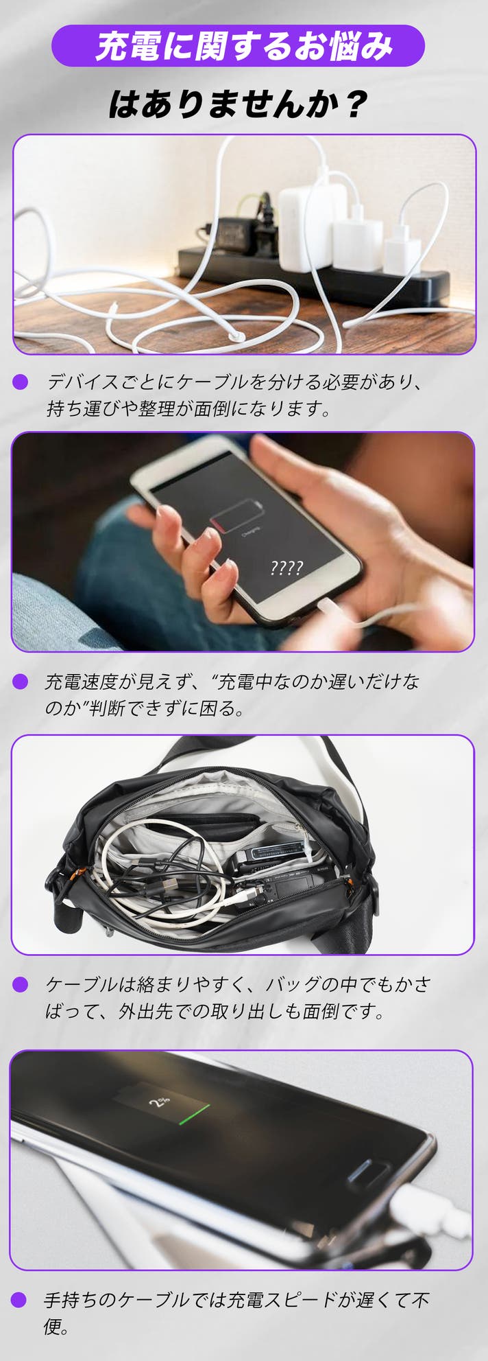 「充電を、もっと自由に。」 という想いのもと、どこへでも持ち運べる、ファッションにも馴染む、そして一つで多くのデバイスに対応できる充電アイテムを生み出しました。