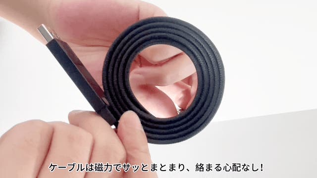 - バンド不要で磁力がしっかりホールド。フラット設計だから巻いてもかさばらず、スマートに収納できる