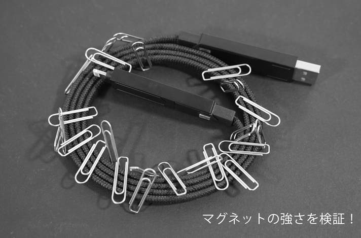 CHARGO 4in1マグネット式充電ケーブルがケーブルを巻き取る方法は、小物の整理グッズでよく使われるテープ、ワイヤーリール、マグネットクリップなどとは違います。ケーブルの中間レイヤーに含まれる高密度のマグネット粉末により、ケーブル同士が強い磁気により引き合い、優れた磁吸能力を発揮します。