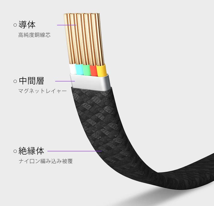 頑丈な作りで、断線防止のための強化加工を施しています。ナイロン/マグネットレイヤー/高純度銅線を組み合わせた多層構造により、柔軟性と耐久性を兼ね備え、折れや変形が起こりにくい設計を実現しました。