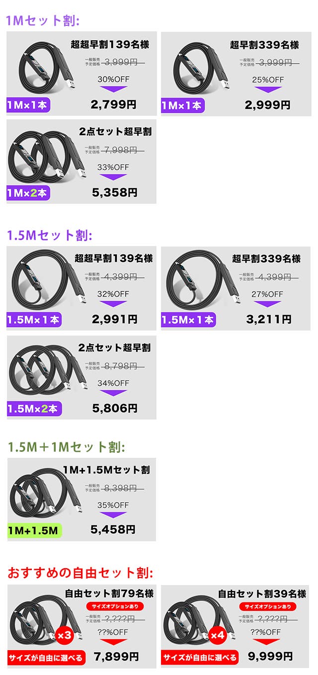 ※本リターンは固定価格でご提供します。お客様は「1.5m」または「1m」のケーブルを自由に組み合わせて、合計4本お選びいただけます。