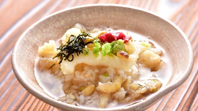 3.オコゼの白身や具を御飯の上に置いて、出汁をかける。出来上がり。