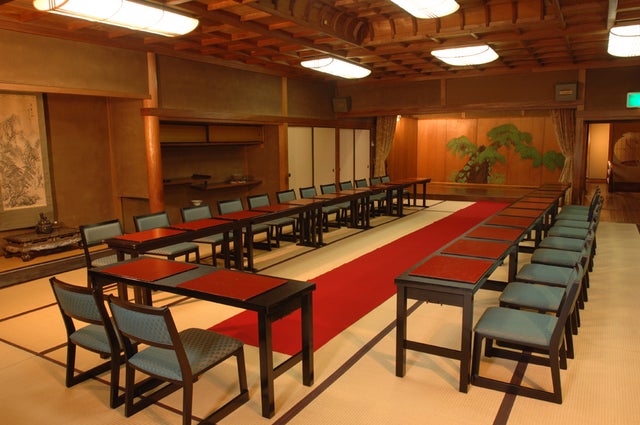 昭和25年頃改装して今の総檜造りの数寄屋造りになりました。大広間の天井は格天井といいます。能舞台があります。
