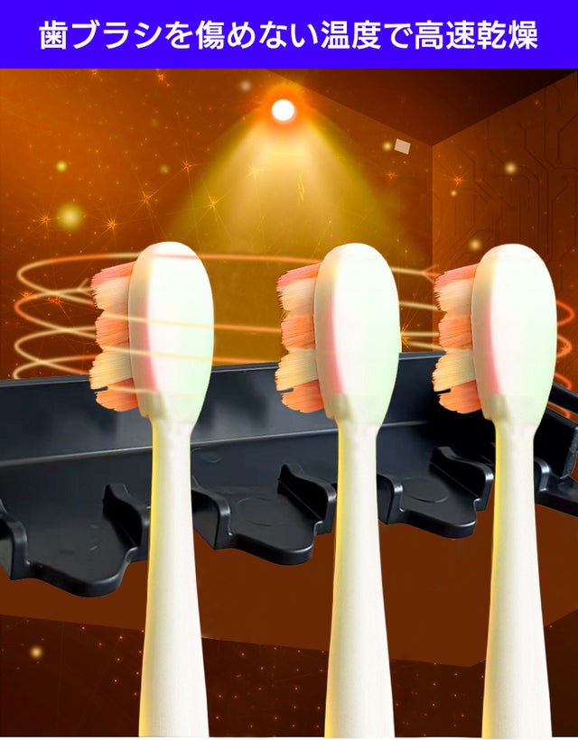 内蔵の乾燥機は、毛先を傷めない温度で歯ブラシの水分を蒸発させ、高速かつ、しっかり歯ブラシを乾燥させます。