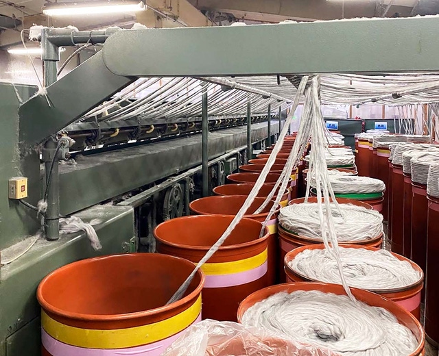 2.まずは縫製工場にて発生した裁断くずを集め、紡績工場へ発送します。紡績工場にて裁断くずと原綿を混ぜ合わせ、再紡績を行います。