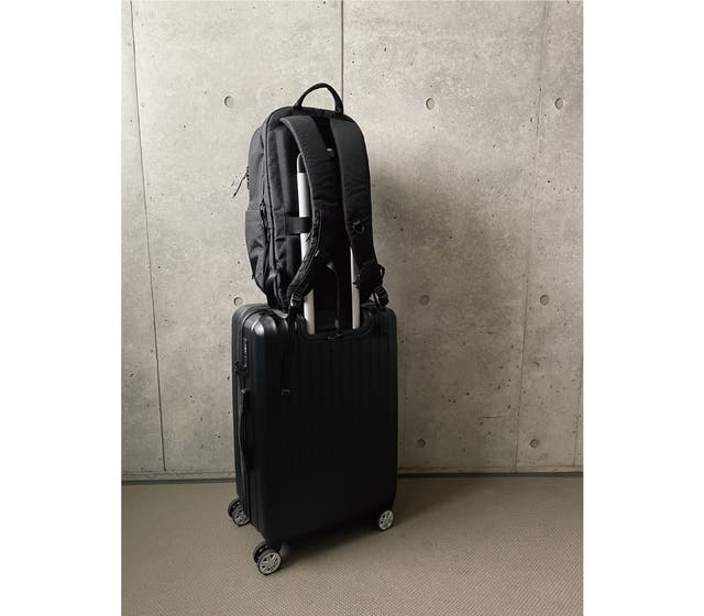 バックパック背面にはパススルーベルトもついているので、キャリーケースにしっかりと固定する事が出来ます。