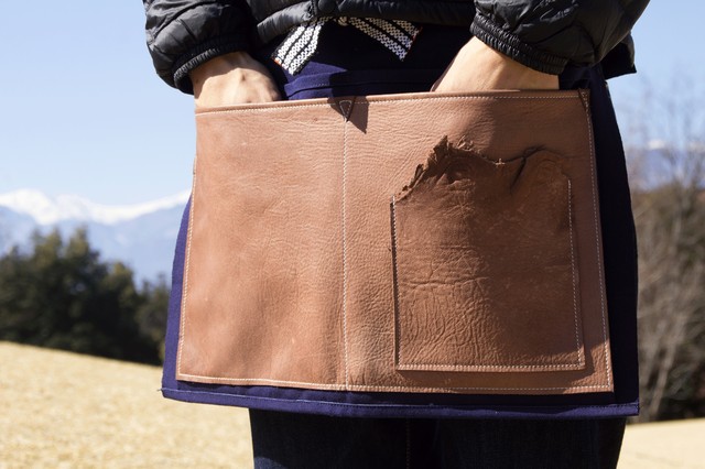丈夫で水にも強い革の生地なので、キャンプなどアウトドアシーンでも大活躍のエプロンです。