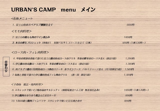 鹿肉をメインにしたワインバル「urban's camp 」を、山梨県甲府市でOPENします。