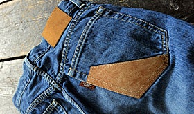 の富士山の形をモチーフにしたバックポケットのパッチをwild material gearの焼印を捺した鹿革パッチにカスタマイズします。