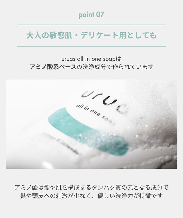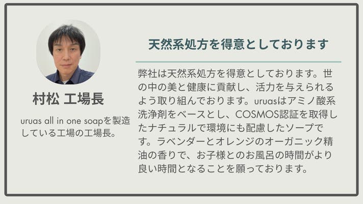 その他、美容のプロを含めた開発チームより、このuruas all in one soapが完成しました。