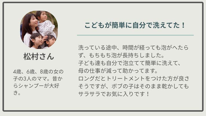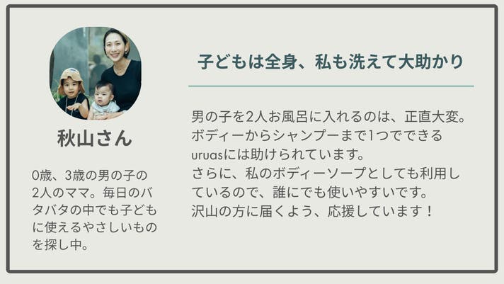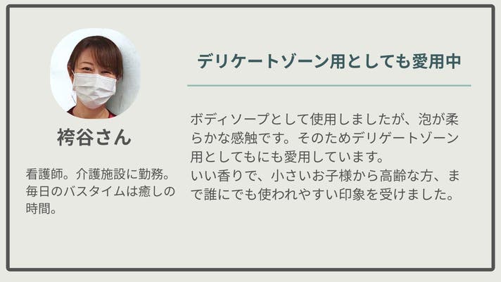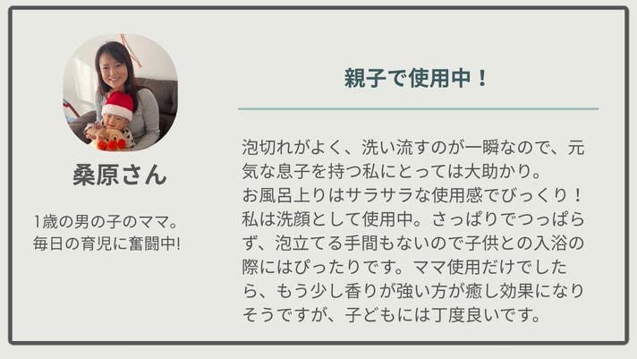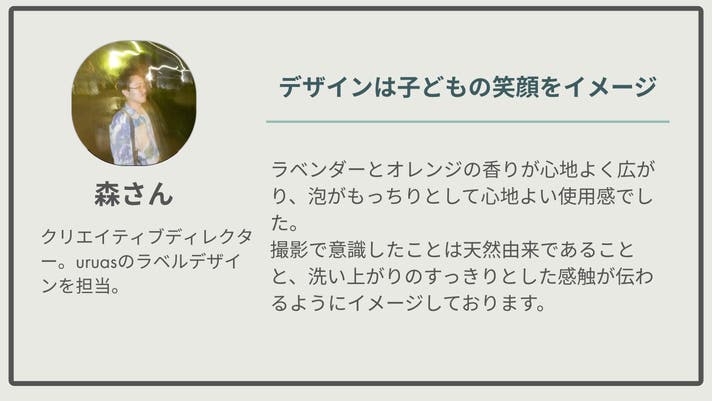 肌の弱い我が子に合うソープに巡り合えず、苦悩したことをきっかけに製品の開発に至りました。同じ悩みを抱える親子を少しでも減らすことをミッションにしています。