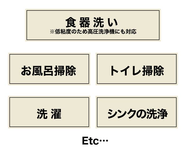 100%自然由来成分を使用した石けん系洗剤であるため、日常の食器洗いも利用できますし、洗浄力にも自信があるためキッチン周りの頑固な油汚れや毎日のお風呂掃除にもマルチに活躍するからです。