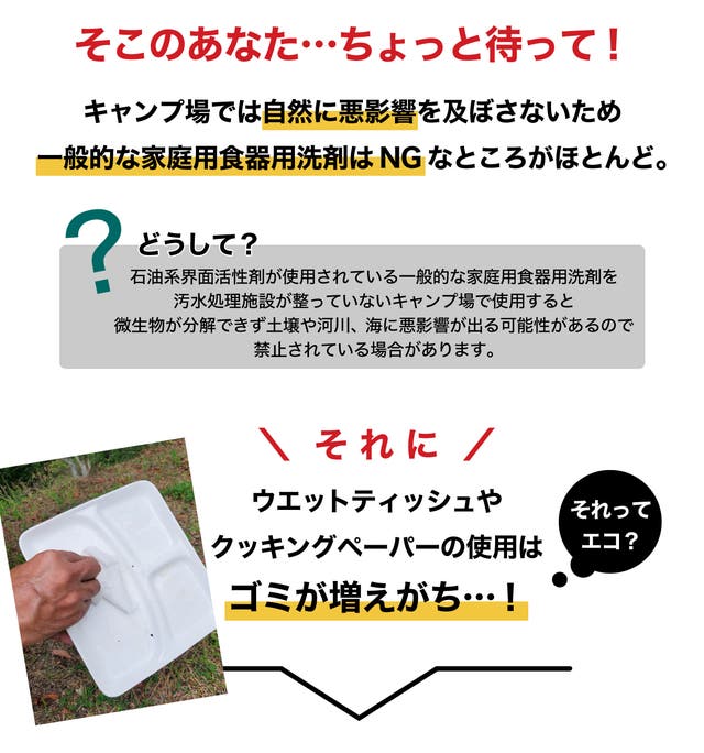 そのため、汚水処理設備が整っていない山・川・海などでもお使いいただけます。