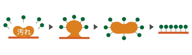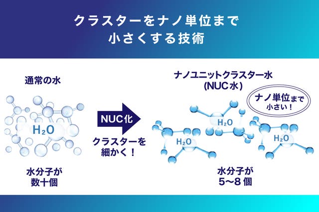 水の分子をナノ単位まで小さくした、ナノユニットクラスター水(NUC水)を使用。分子の小さな水に洗浄成分が混ざり合うことで、汚れの隅々にアプローチすることが可能です。