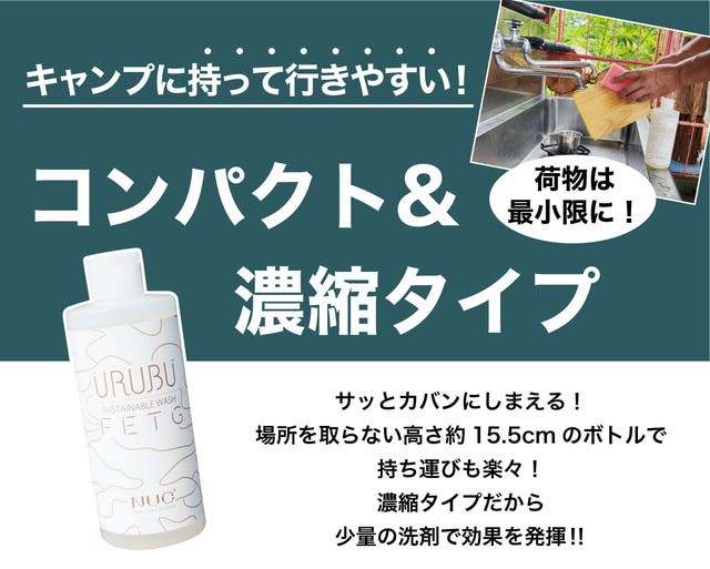 キャンプ時の荷物はなるべく減らしたいもの。URUBU®︎ SUSTAINABLE WASHはキャンプに持って行きやすいコンパクトサイズ。ボトルは小さくても濃縮タイプなので、少量で油汚れやタンパク汚れをしっかり落とします。さらにワンタッチ開閉のヒンジキャップタイプを採用で持ち運びやすさをカバー。アウトドアシーンでの使い勝手にこだわりました!