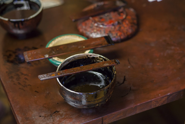 漆はウルシオールという物質で構成され、水分に反応して堅くなります。そのため「漆がよく乾く」のは、湿度が高い梅雨から夏の季節。毎朝、湿度や温度を感じながら配合を調整して丁寧に仕上げていきます。