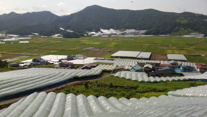 ぶどう園は毎年3月からビニールがかけられます。雨風の影響を受けず作業ができます。