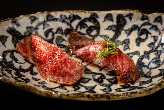 ・短黒和牛の炙り肉寿司 (赤身と霜降り二種)
