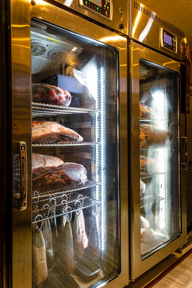 店内に設置した、牛肉を熟成させるための冷蔵庫で、牛肉が凍るか凍らないかという0度前後の温度帯で熟成をかけます。