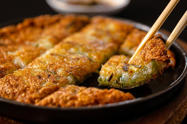 当店で、初めてこのチヂミを食べてハマる人が続出。それくらい、癖になるおいしさです。