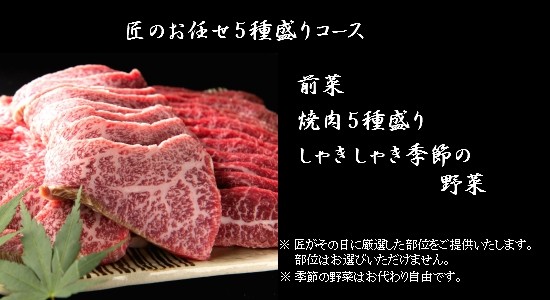 「匠のお任せ5種盛りコース」は、その日、匠が選んだ5種類のお勧めの部位をご提供致します。例えば「みすじ (腕部位)」「くらした(肩部位)」「内もも (もも部位)」「ランプ (もも部位)」「しんしん(もも部位)」などをご用意致します。(ご提供する部位は毎日変わります。)