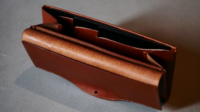 1枚の革を折り込んでいって作った外装で 内側には長財布「gotye」のカード入れをさらに簡略化して効率的で使いやすい構造にした『斜めスリットが並ぶカード入れ収納』を設計しました