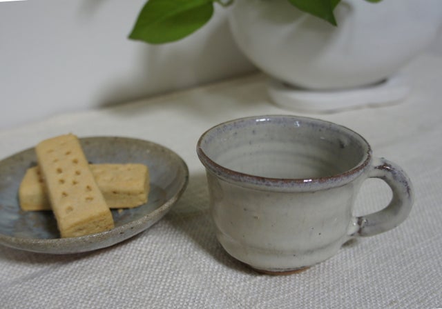 少し紫がかった乳白色の釉色で爽やかな感じの珈琲碗です。角の無い手は滑らかな感触で温かみあり軽い持ち心地。釉が薄くなった口縁は薄紫色をしており、育ちが楽しみです。