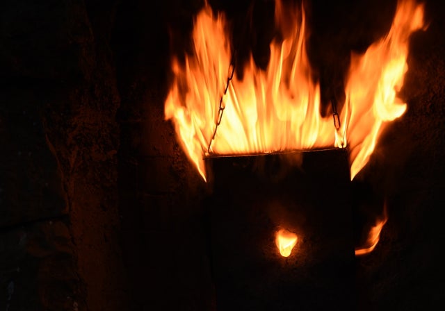 斑唐津の釉薬原料となる餅藁は自らの手で燃やし、数カ月かけて上記の様な黒い灰に仕上げます。更に餅藁灰・土灰・長石を混ぜ合わせ、幾つかの工程を経て釉薬が出来上がります。