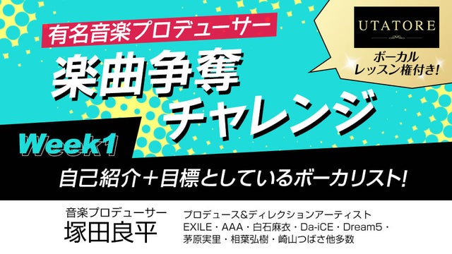 WEEK1+WEEK2の累積ポイント上位5名(+α)のキャストは、UTATOREでボーカルレッスン♪決勝で最もポイントを獲得したキャストには音楽プロデューサー:塚田良平氏が全面プロデュースの楽曲を提供!!