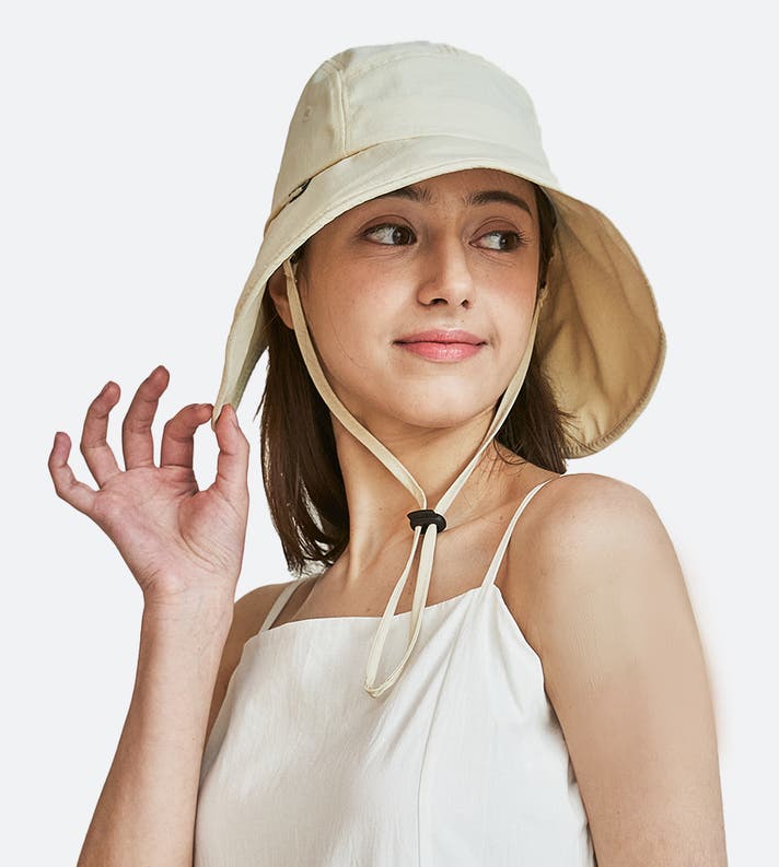 実は、UVケアを主目的としない帽子では『横から差し込む西日』や『地面からの照り返し』を完全に防ぐことはできません。 正面だけでなく、あらゆる角度から襲ってくる紫外線をカットしなければ、本当のUVケアとは言えないのです。」