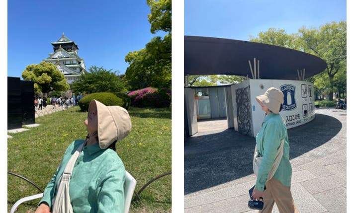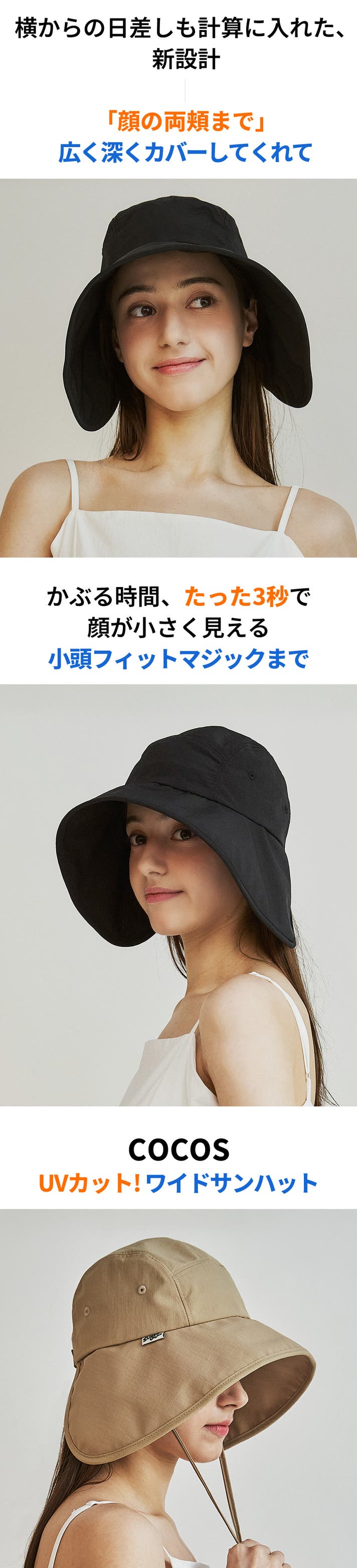 COCOSワイドサンハットは、前と横に降り注ぐ紫外線のために、時間帯別に日差しが顔に当たることをテストし、最上の長さにつばを製作しました。