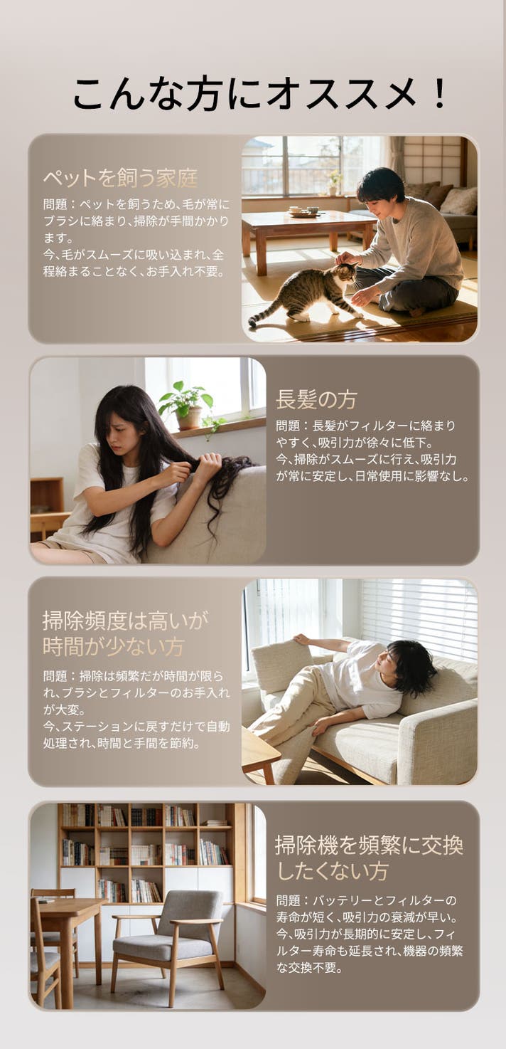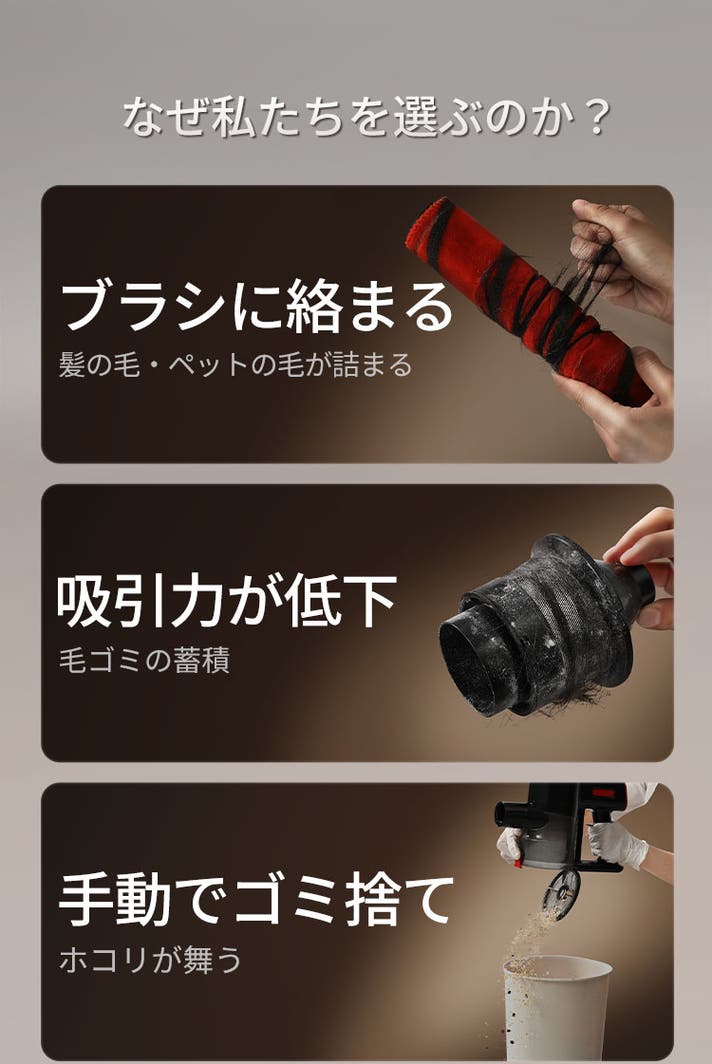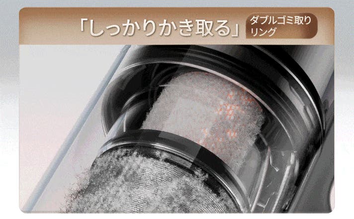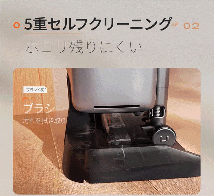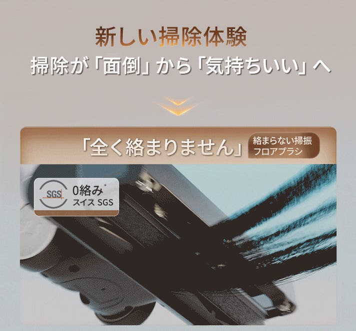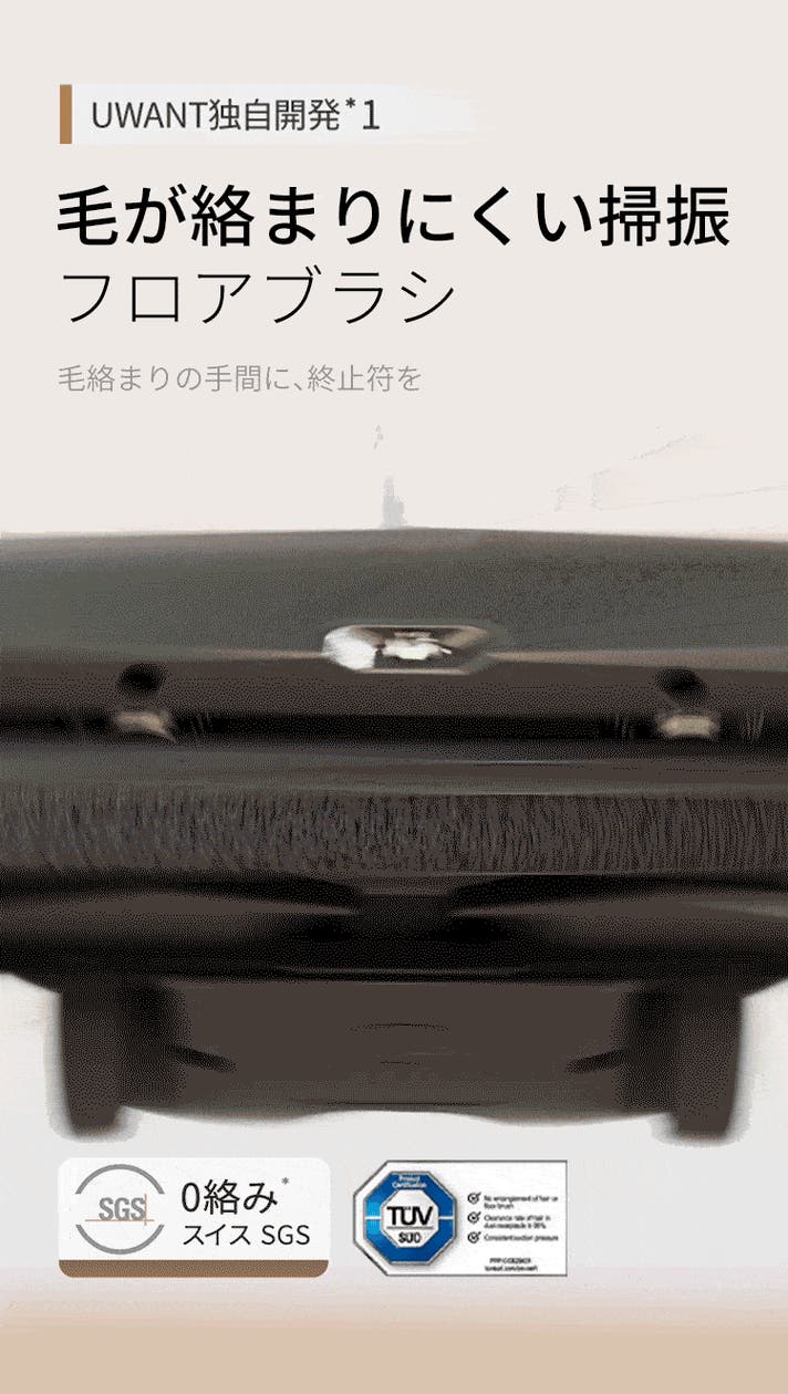 - 独自開発の掃振フロアブラシにより、毛髪の「0」絡まりを実現。