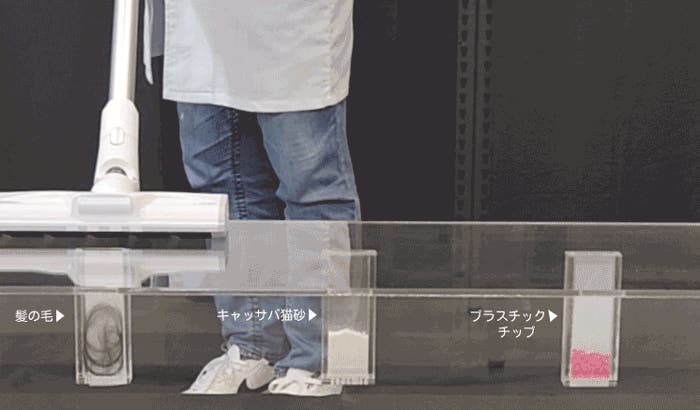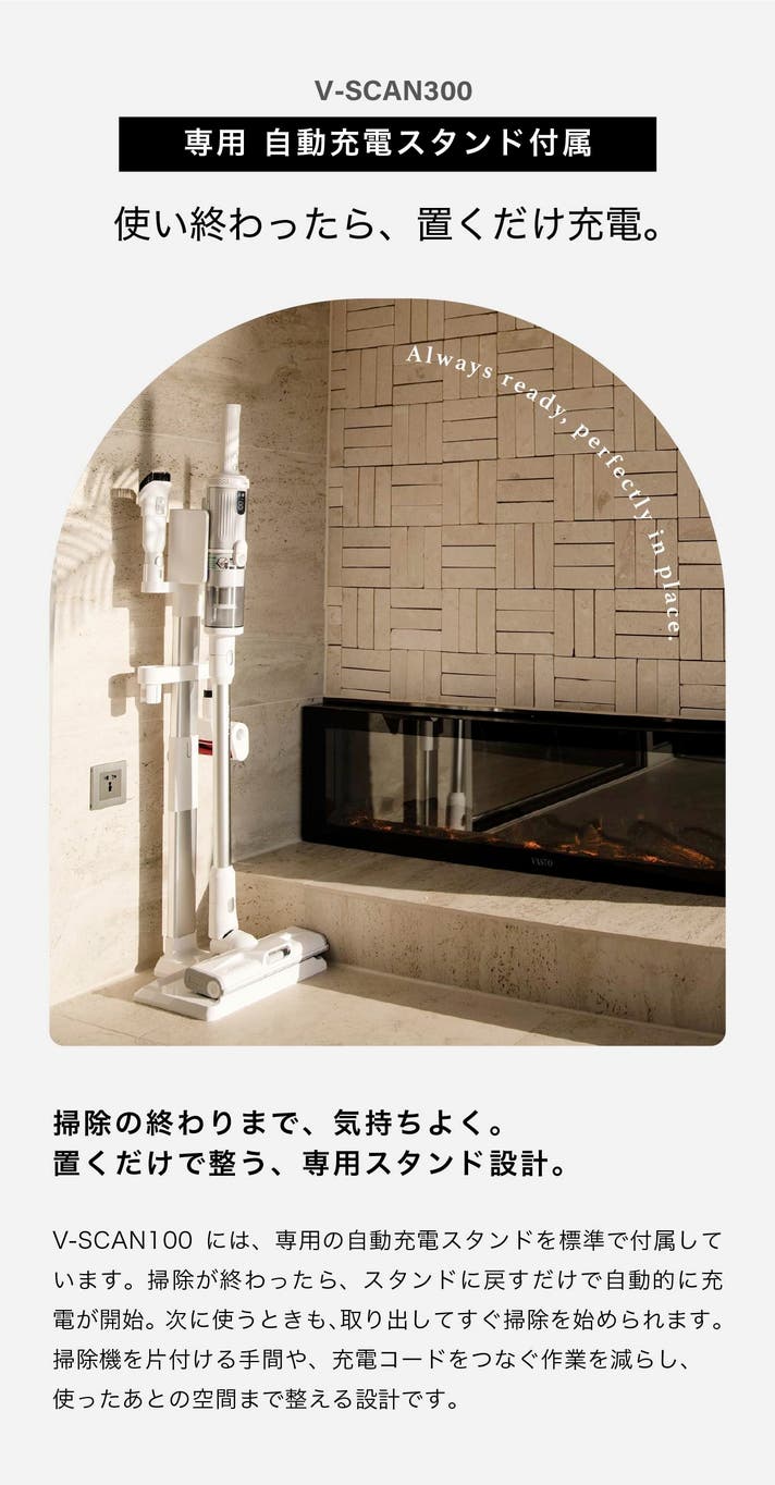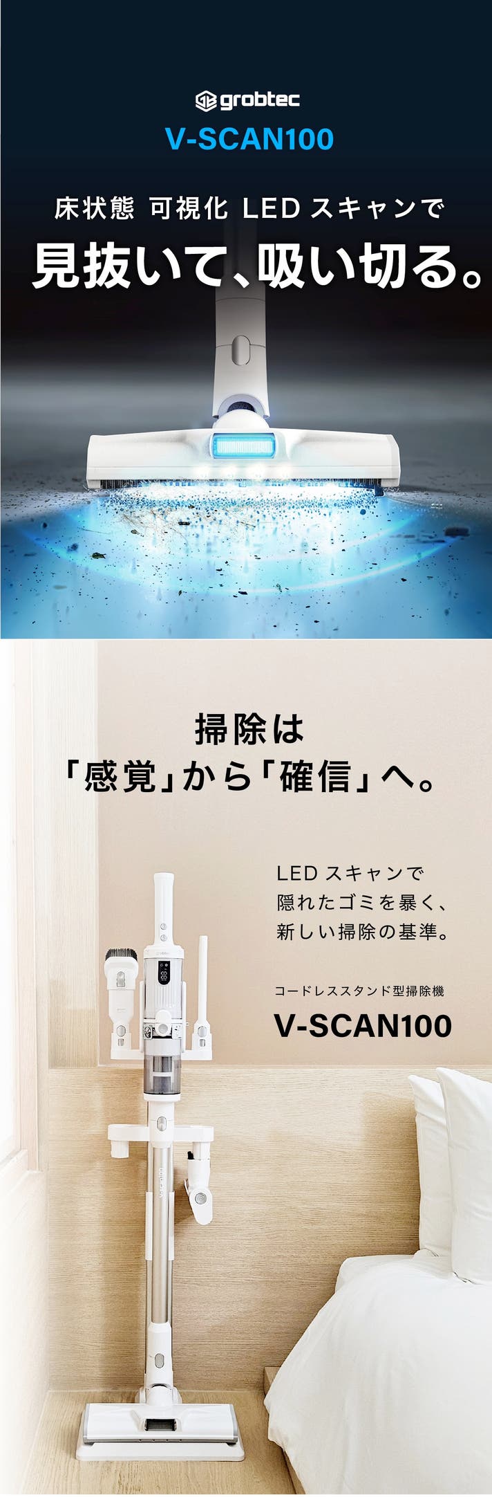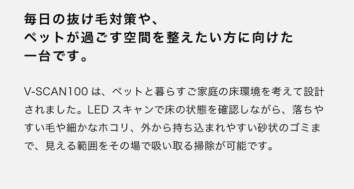 V-SCAN100は、掃除中に床の状態を確認しながら使うことを前提に、安定した吸引力を発揮する高性能BLDCモーターを採用しています。ホコリや髪の毛、ペットの毛など、LEDスキャンで確認したゴミを、その場で処理できるよう設計されています。