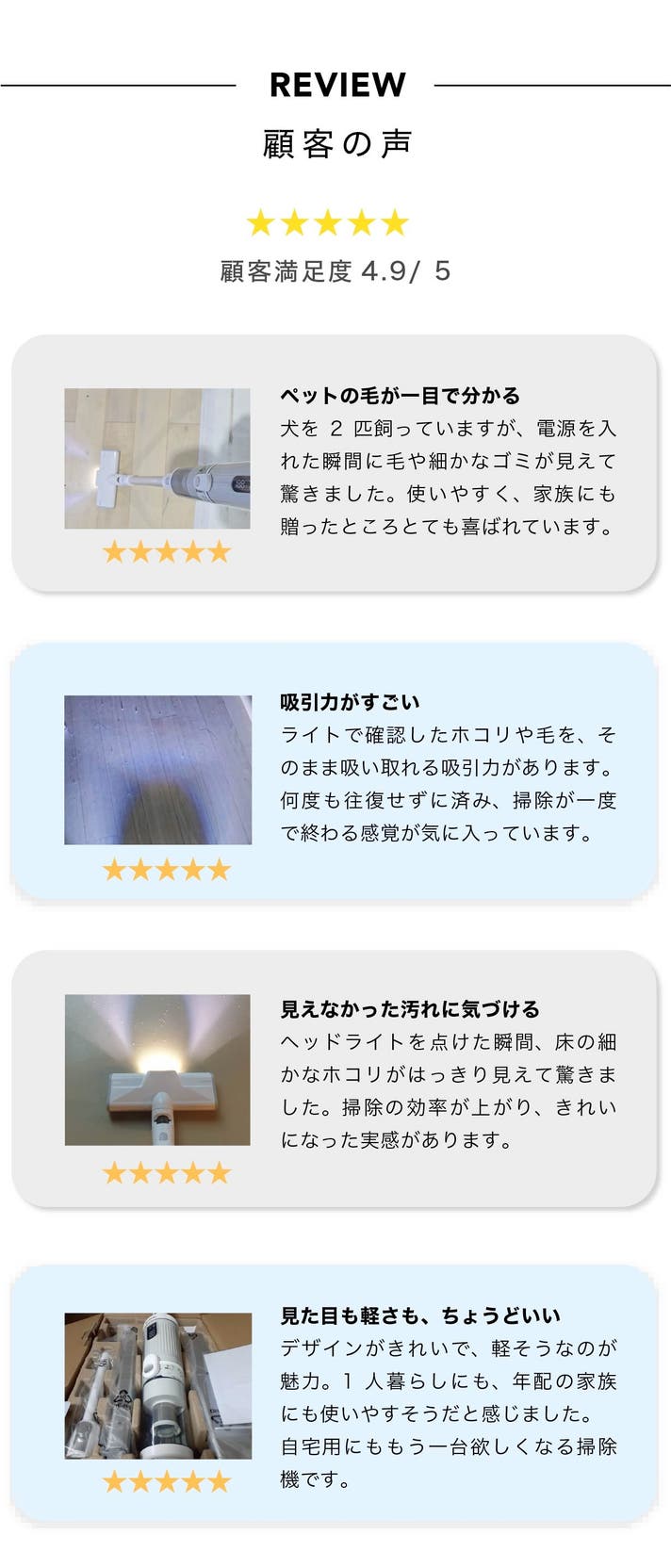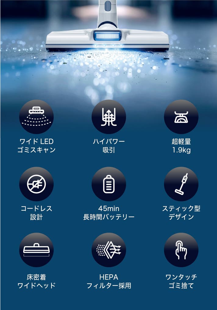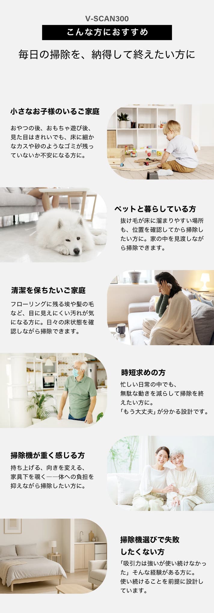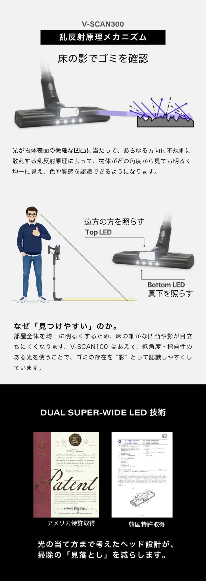 - 【床の状態を可視科】LEDスキャンにより、隠れたゴミや毛を見抜き、やり残しのない掃除を可能に。