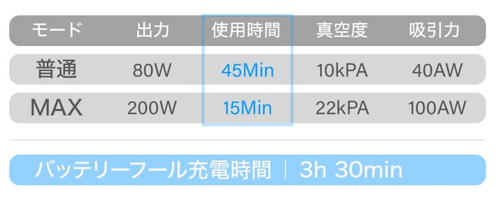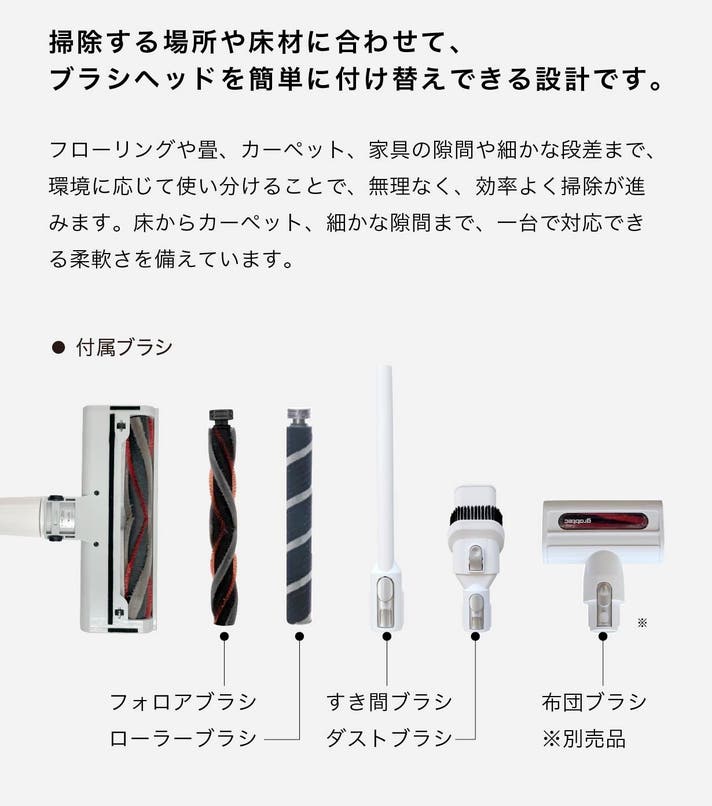 ※ 吸引力や連続使用時間などの数値は、メーカー測定条件下での参考値です。使用状況やモード、床材、バッテリー残量により変動します。